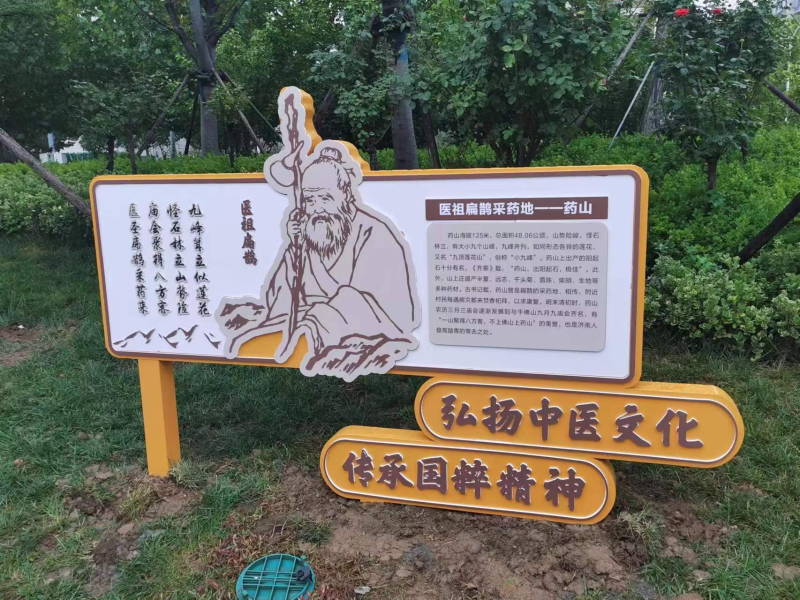 依托扁鹊药山采药地独特资源,组织5家中医院打造了6块中草药种植园,种植金银花、菊花、山楂、银杏、石榴树、麦冬、白芍、薄荷、藏红花、丹参、白蜡、木槿、茜草、构树、鸢尾、月季、木瓜、女贞子等二十余种中草药,设置药草展示板,注明了药名、形态特征、药用部位、性味归经、功能主治、地理分布等内容,让更多人了解中草药、认识中草药、喜爱中草药。