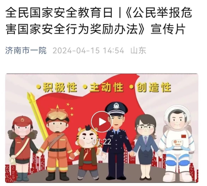 二、利用“济南市一院”公众号播放《公民举报危害国家安全行为奖励办法》宣传片、反间谍法宣传海报等。