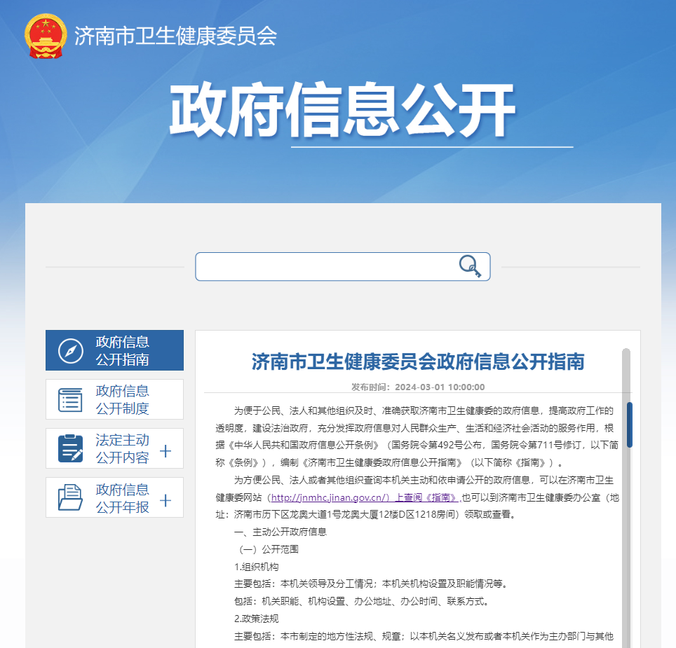(三)政府信息管理情况。根据市政府办公厅工作要求,加强委网站信息管理及动态更新,及时更新了《政府信息公开指南》,制定并发布了《济南市卫生健康委员会2024年政务公开工作实施方案》。
