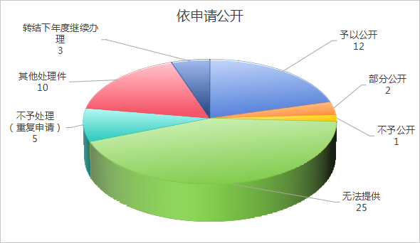 (二)依申请公开情况。全年受理依申请公开58件,其中本年度办理50件,上年度结转办理8件。具体是予以公开12件、部分公开2件、不予公开1件、无法提供25件、不予处理(重复申请)5件、其他处理件10件、转结下年度继续办理的3件。