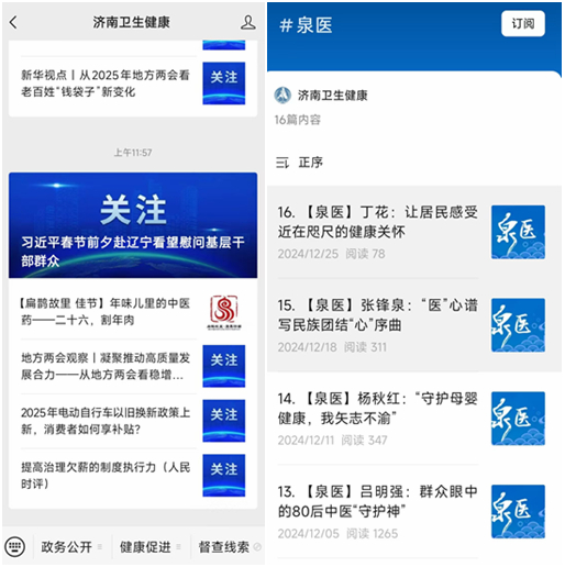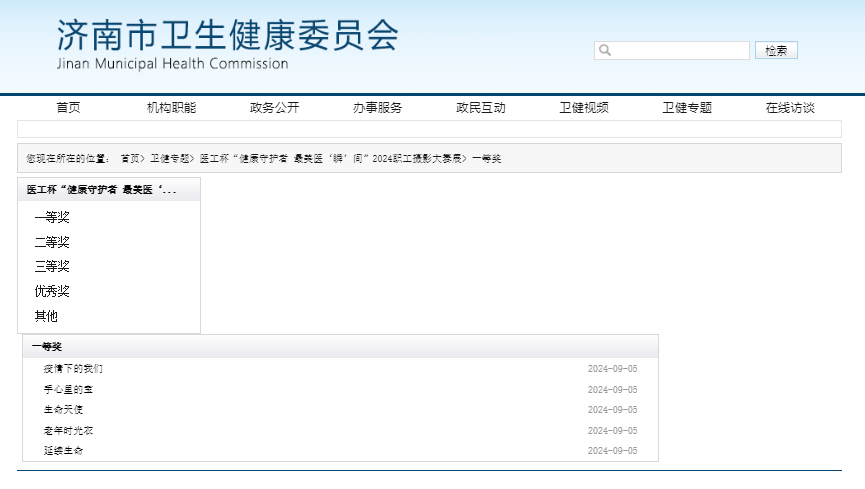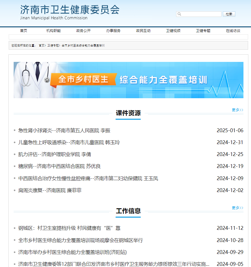 委网站开设“全市乡村医生综合能力全覆盖培训”“医工杯“健康守护者 最美医‘瞬’间”2024职工摄影大赛展”等专栏,通过发布相关专家的课件,加强对全市乡村医生的培训,有力提升了乡村医生的业务能力和服务患者的水平;用医护工作者工作的精彩图片,展现健康守护者的最美瞬间。政务新媒体“济南卫生健康”微信公众号推出“泉医”专栏,近距离展示泉城名医风采,获评全市优秀政务新媒体。