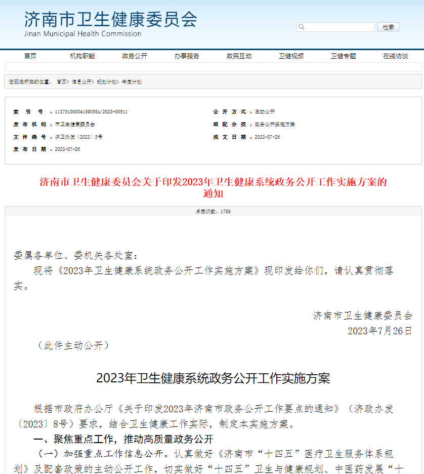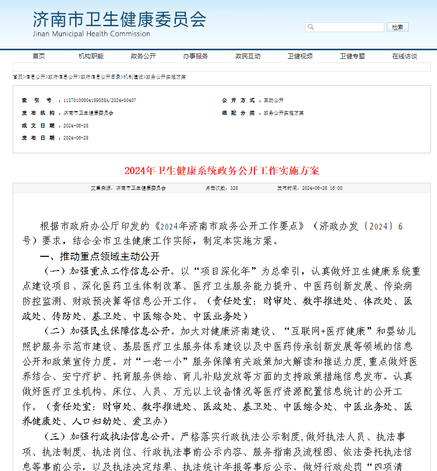 2024年,济南市卫生健康委以习近平新时代中国特色社会主义思想为指导,牢固树立健康优先的发展战略,深入贯彻落实《条例》和市政府办公厅有关要求,结合全市卫生健康工作实际,持续深化政府信息公开工作,推动卫生健康政务公开工作质效提增。