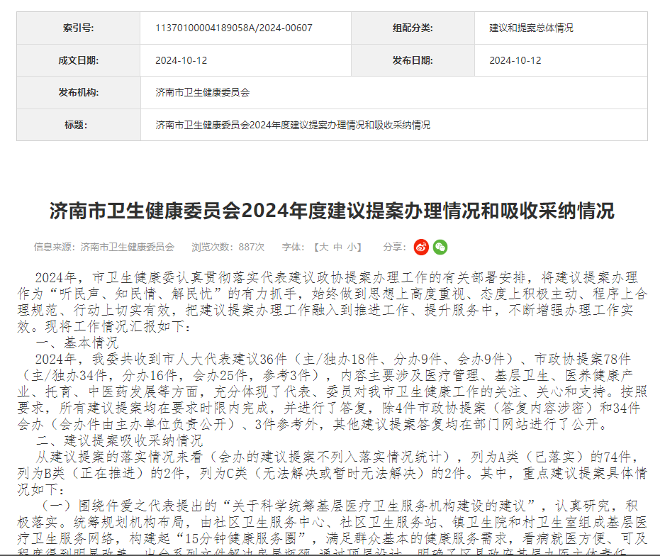 2024年,济南市卫生健康委共收到市人大代表建议36件(主/独办18件、分办9件、会办9件)、市政协提案78件(主/独办34件,分办16件,会办25件,参考3件),内容主要涉及医疗管理、基层卫生、医养健康产业、托育、中医药发展等方面。按照要求,所有建议提案均在要求时限内完成,并进行了答复,除4件市政协提案(答复内容涉密)和34件会办(会办件由主办单位负责公开)、3件参考外,其他建议提案答复均在委网站进行了公开。从建议提案的落实情况来看(会办的建议提案不列入落实情况统计),列为A类(已落实)的74件,列为B类(正在推进)的2件,列为C类(无法解决或暂时无法解决)的2件。